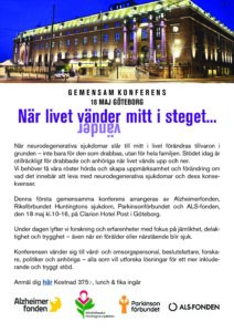 Den 18e maj kl.10-16 på Clarion Hotel Post i Göteborg bjuder vi in till en gemensam konferens. Vi arrangerar den här konferensen tillsammans med Alzheimerfonden, Parkinsonförbundet och ALS-fonden. Den här dagen…