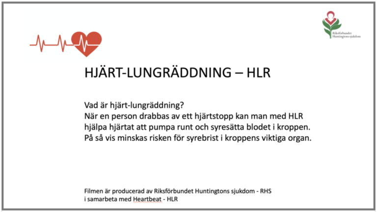 HJÄRT-LUNGRÄDDNING – HLR Använd filmerna i er verksamhet nu under covid-19 tider då det är svårt att samla personal och genomgå en utbildning på vanligt vis. OBS! För att beställa filmen med er egen loggo och för er hemsida/er verksamhet kontakta RHS för pris samt information på: info@huntington.se Filmerna är producerade av Riksförbundet Huntingtons sjukdom…